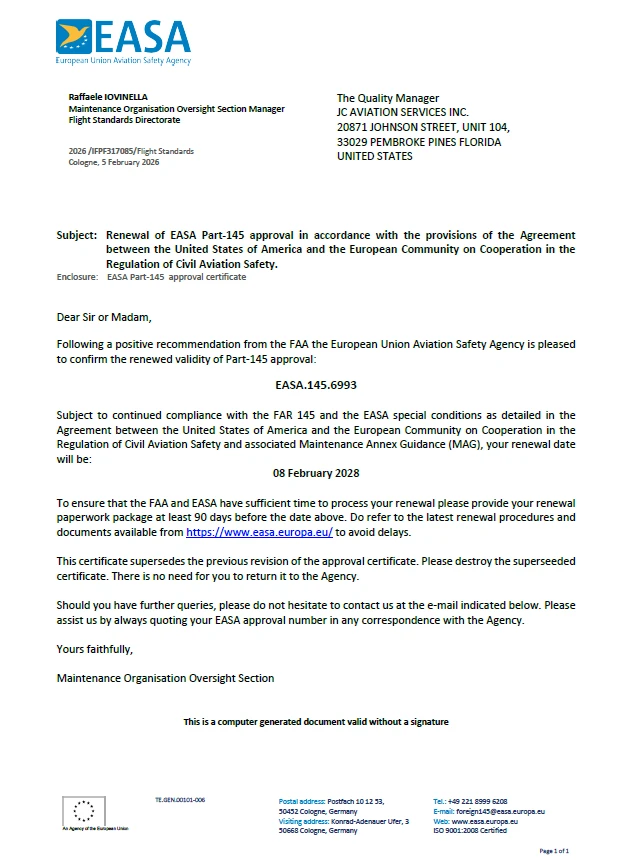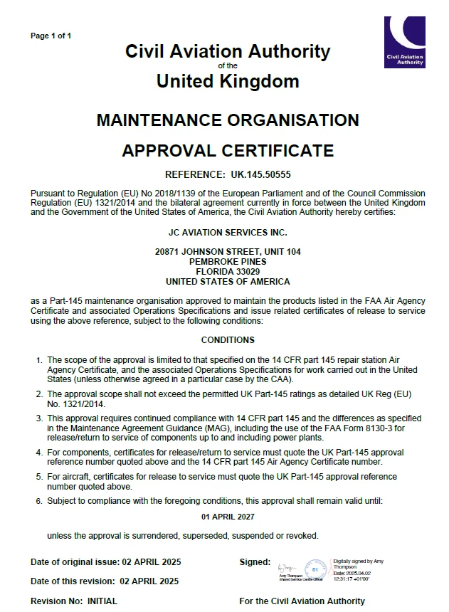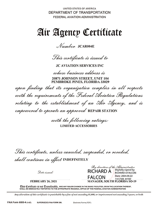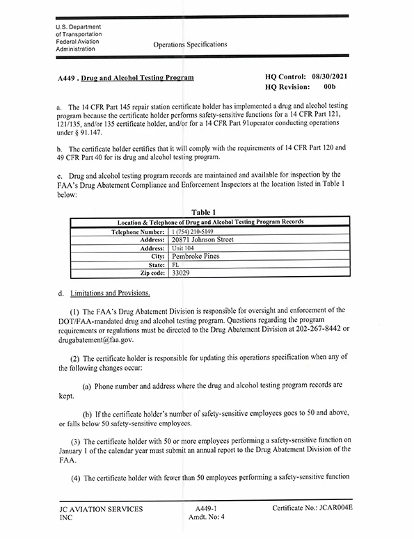 CERTIFICATIONS A449 Drug and Alcohol abatement JC Aviation DOWNLOAD EASA Certificate DOWNLOAD FAA Certificate DOWNLOAD Capability List DOWNLOAD JC Operations Specifications DOWNLOAD UK CAA Certificate DOWNLOAD